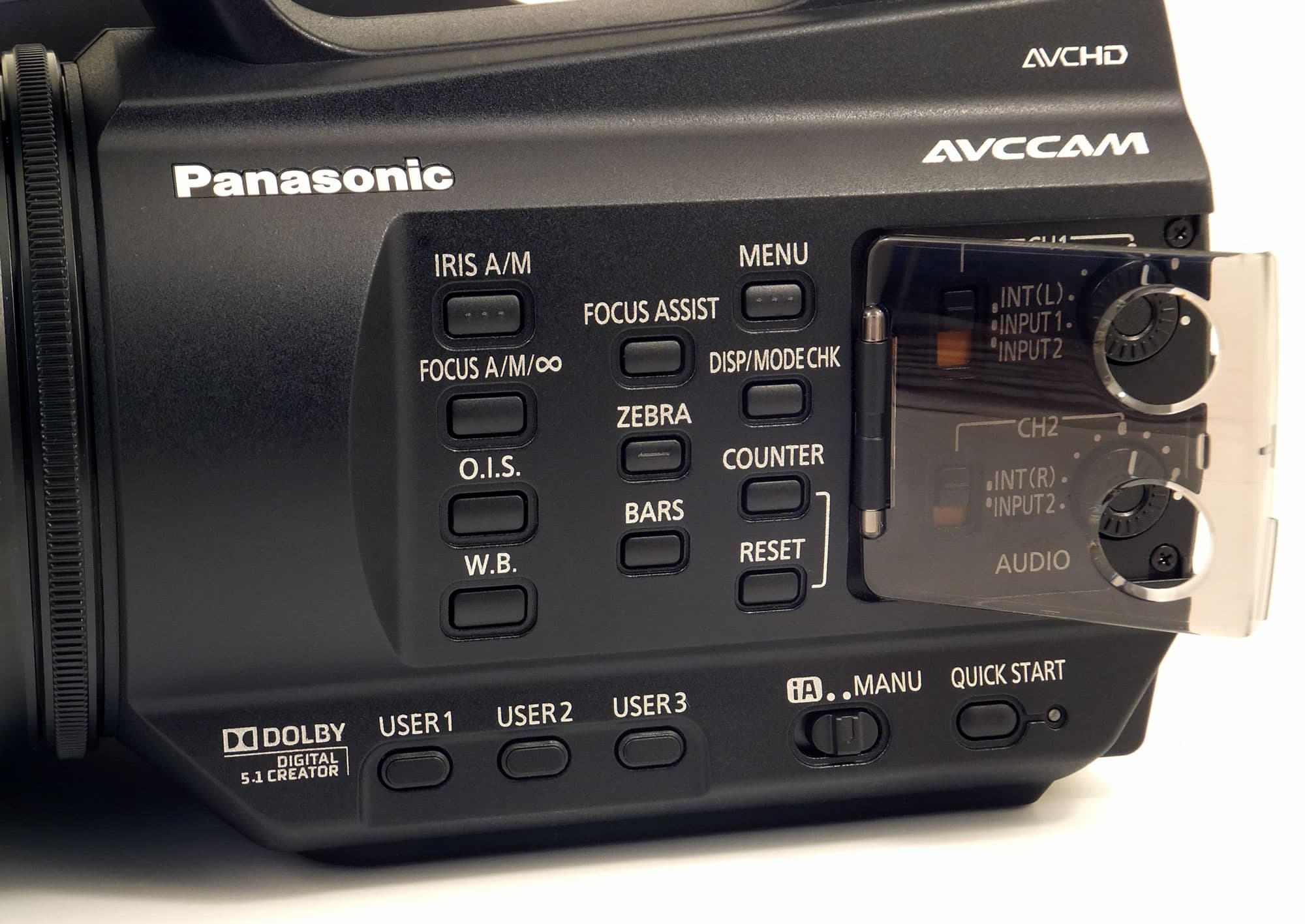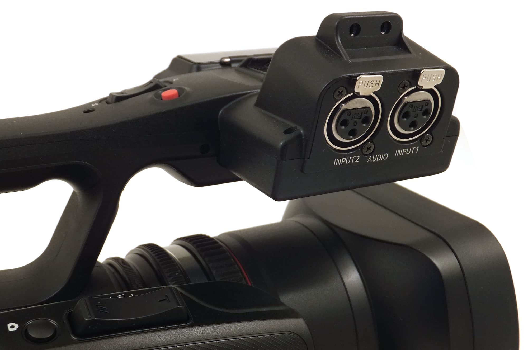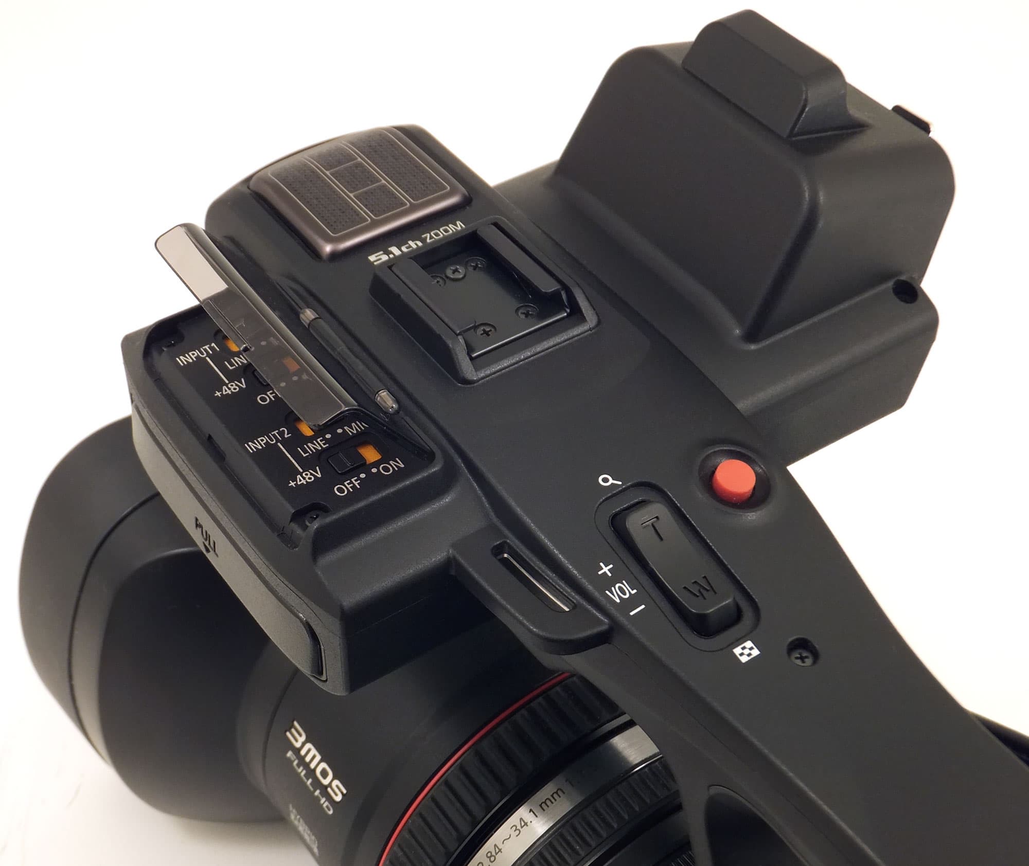 В передней части рукоятки имеется панель с четырьмя двухпозиционными переключателями. Здесь имеется возможность управлять источниками аудиосигнала, подавать на них фантомное питание. Панель эта закрыта прозрачной крышкой. Рядом с ней расположен многоканальный микрофон и площадка для крепления аксессуаров. Если видеокамеру взять за эту верхнюю рукоятку, то под большим пальцем руки окажется дублёр качалки зума и вторая кнопка старта/остановки видеозаписи.