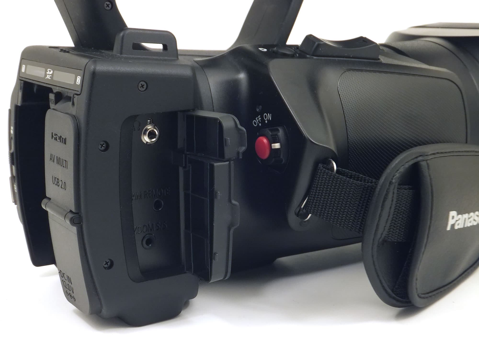 На торце камеры расположен интерфейсный блок, прикрытый откидывающейся крышкой. Здесь находится выход HDMI стандартного размера, мультивидеовыход (компонентный и композитный вместе со стереозвуком) и порт USB 2.0. Дополнительный вход для подключения сетевого адаптера прячется в боковой стенке ниши аккумулятора. Таким образом, камеру нельзя запитать от сети, не отсоединив перед этим батарею. Камера комплектуется литиево-ионной батареей ёмкостью 5400 мА·ч, зарядка аккумулятора осуществляется с помощью прилагаемого зарядного устройства. Полностью заряженная батарея позволяет вести беспрерывную видеосъёмку в течение 7 часов в «щадящем» режиме HE (1440×1080 50i) и с отключённым (закрытым) ЖК-экраном.