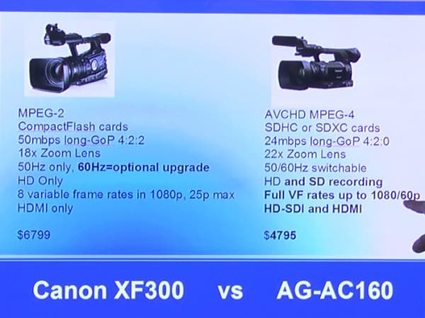 Canon использует устаревший MPEG-2, хотя и пытается компенсировать это большим битрейтом. Битрейт всё равно не в пользу Canon, странный выбор носителей информации CompactFlash, против P2 у Panasonic, с повышенной надежностью и большим числом циклов перезаписи. Panasonic используется новейший 10-битный AVC-Intra кодек MPEG-4. Переключение 50/60 к/с сразу же у Panasonic и за дополнительные деньги у Canon. Небольшое преимущество в кратности зума, не очень важно, но всё равно преимущество. Также до сих пор многие телеканалы требуют предоставить материалы в SD. Эта возможность специально оставлена для совместимости. Кроме того, по MSRP (рекомендованной производителем) цене Panasonic находится в выигрыше, и значительном.