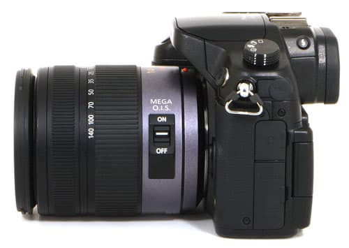 Объектив, прилагавшийся к предоставленному на тестирование фотоаппарату, имеет десятикратный оптический зум и оптический стабилизатор изображения, который включается и отключается расположенным на корпусе объектива ползунком. В левой части корпуса находятся прикрытые резиновыми заглушками разъемы:
