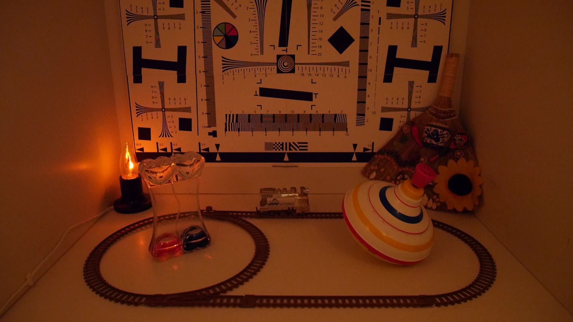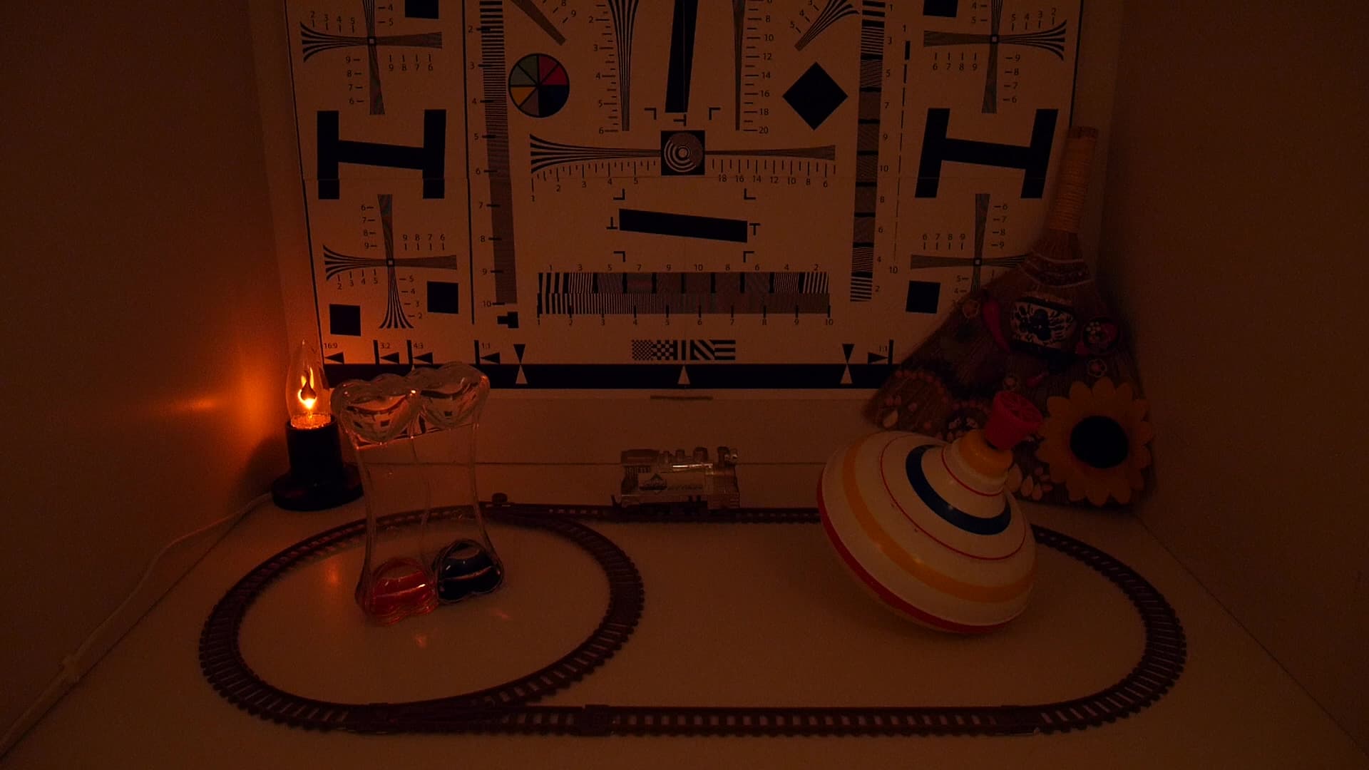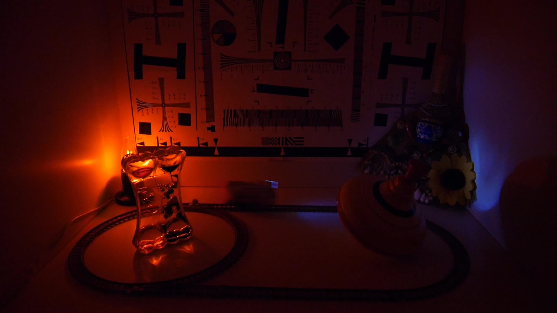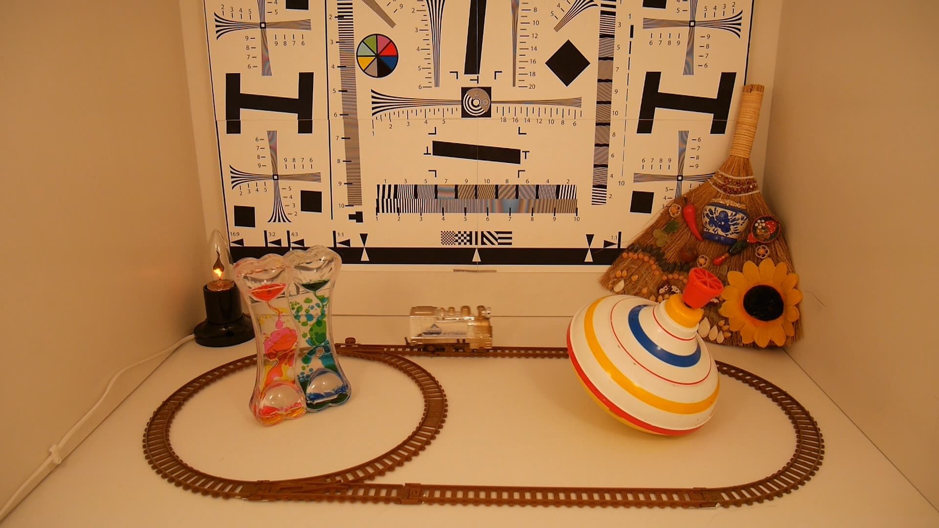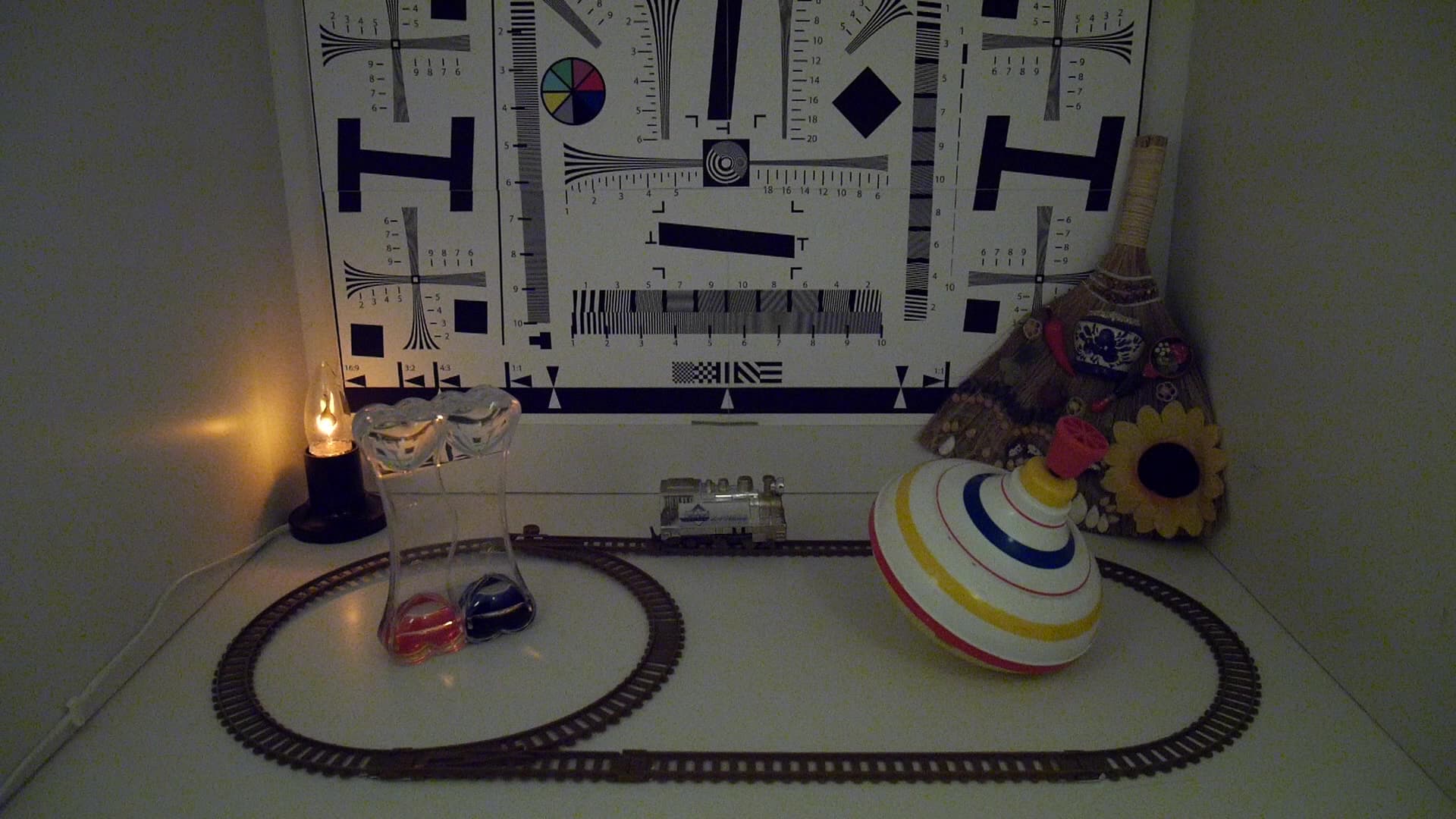 Пусть читателя не смущает уведенная в красноту картинка — виной тому лампы накаливания, меняющие свою температуру вместе с изменением потребляемой мощности, а также близкое их расположение к объективу камеры и находящимся в кадре объектам. До освещенности в 5 люкс включительно автоматика камеры компенсирует нехватку света не только открытием диафрагмы и увеличением чувствительности, но и снижением выдержки. В результате такого вмешательства видеозапись, имеющая частоту 50 прогрессивных кадров в секунду, будет иметь кадры-дубли, повторяющие друг друга. По этой причине снимать на автоматических настройках в условиях слабой освещенности категорически не рекомендуется. Разрешающую способность камеры визуально можно оценить как имеющую 850 условных ТВ-линий по горизонтали.