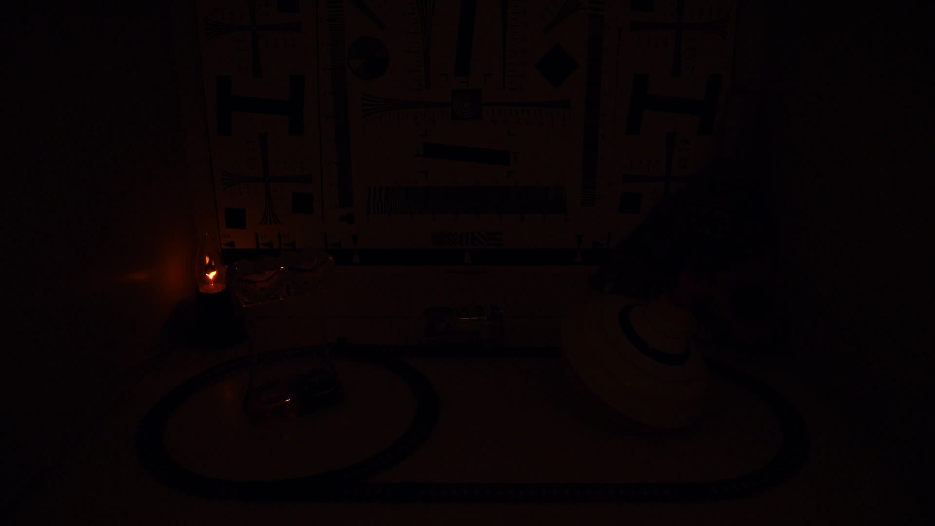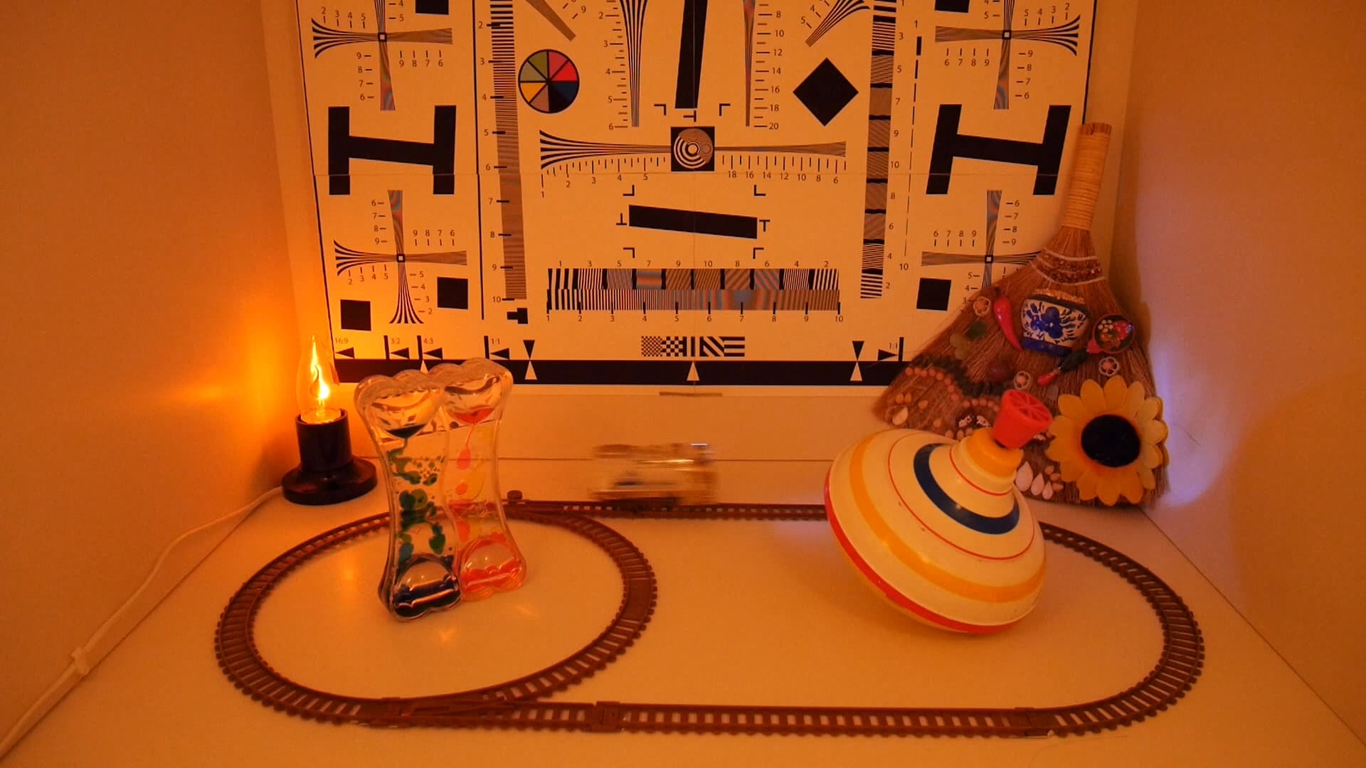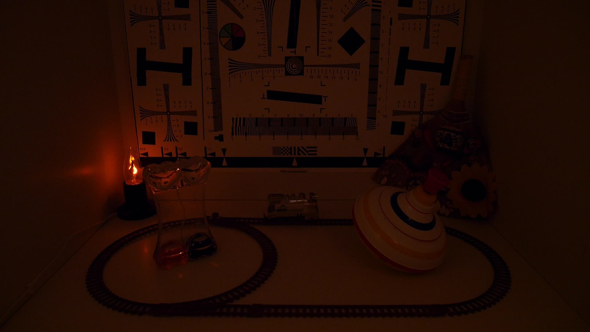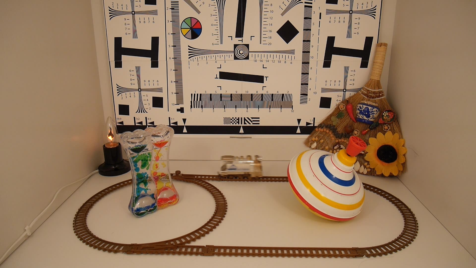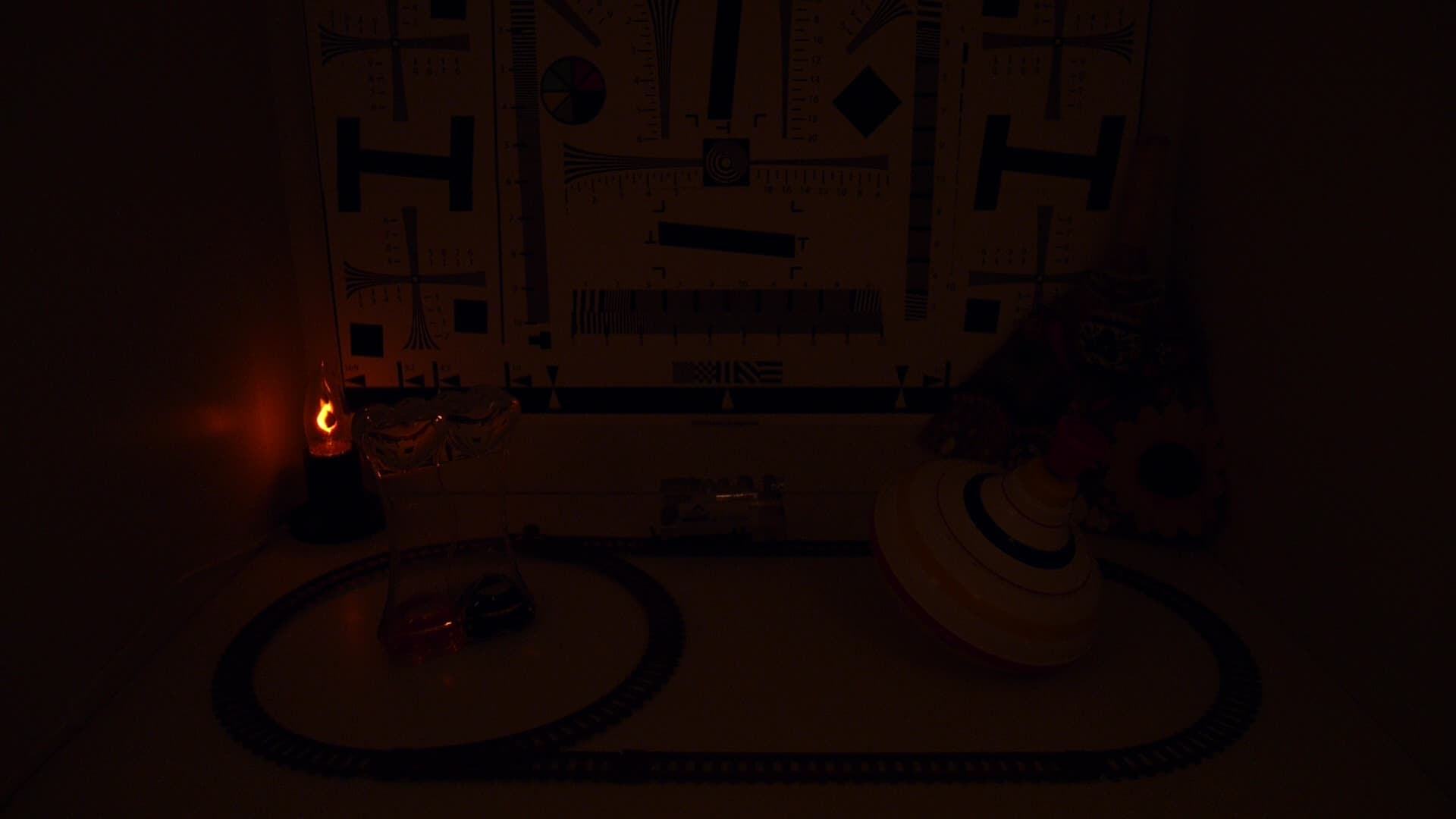 Пусть читателя не смущает уведенная в красноту картинка — виной тому лампы накаливания, меняющие свою температуру вместе с изменением потребляемой мощности, а также близкое их расположение к объективу камеры и находящимся в кадре объектам. До освещенности в 5 люкс включительно автоматика камеры компенсирует нехватку света не только открытием диафрагмы и увеличением чувствительности, но и снижением выдержки. В результате такого вмешательства видеозапись, имеющая частоту 50 прогрессивных кадров в секунду, будет иметь кадры-дубли, повторяющие друг друга. По этой причине снимать на автоматических настройках в условиях слабой освещенности категорически не рекомендуется. Разрешающую способность камеры визуально можно оценить как имеющую 850 условных ТВ-линий по горизонтали.
