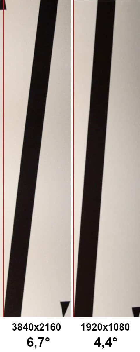 Следующий фактор, который требуется изучить — это роллинг-шаттер (подробнее см. в материале Роллинг-шаттер в видеосъемке — описание дефекта, примеры, пояснения). Для начала произведем измерение наклона вертикалей в двух разных режимах — 4K и Full HD.