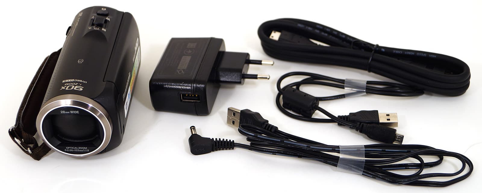 Предоставленный для тестирования экземпляр видеокамеры Panasonic HC-V270 укомплектован сетевым адаптером питания, кабелями USB и HDMI. Обязательно отметим: финальный вариант поставки, «магазинный», может иметь совершенно другой состав аксессуаров.