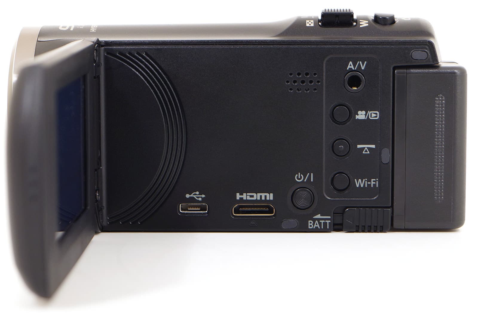Этих кнопок всего три: переключение режимов (камкордер/плеер), электронный уровень (выравнивает кадр относительно линии горизонта при наклоне камеры не более нескольких градусов), кнопка, включающая Wi-Fi, и кнопка питания. Помимо кнопок, на этой боковой панели находится разъем композитного аудио/видеовыхода (четырехконтактный джек 3,5 мм), порт Micro-USB и порт Mini-HDMI.