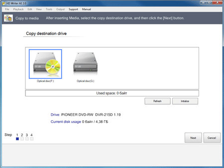 Сохранение материала производится без пересчёта (повторного рендеринга) в единый файл. Помимо создания файла в программе присутствует также и загадочный пункт Copy to media. Однако наши попытки создать структуру хоть какого-то диска окончились неудачей: активация этого пункта ни к чему не привела. По всей видимости, программе требуется Blu-ray рекордер с соответствующим пустым диском. За неимением рекордера и, разумеется, Blu-ray диска, выяснить это предположение не удалось. Программа «видела» вставленный чистый DVD, но отказывалась с ним работать, выдвигая лоток и предлагая поместить подходящий диск.
