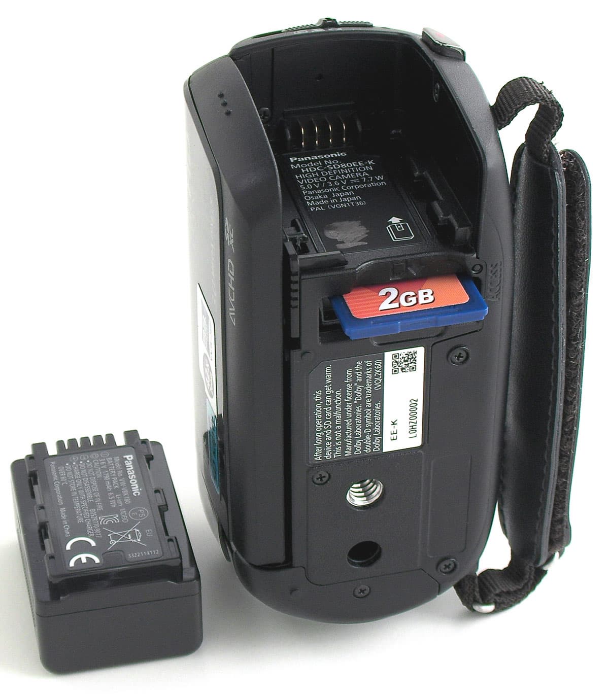 Способ крепления аккумулятора здесь тот же, что и в 90-й модели. Да и сам аккумулятор такой же — VW-VBK180. С помощью полностью заряженного аккумулятора непрерывная видеосъёмка возможна в течение 105 минут при открытом (работающем) ЖК-экране, и до 108 минут при закрытом. Экономия, как видим, совсем мизерная.