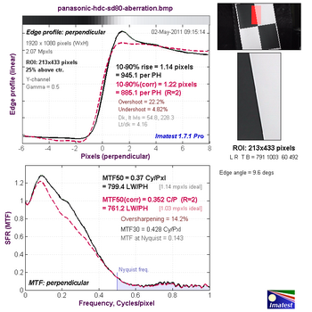 Верхний график представляет собой краевой профиль, для которого приведено значение 10—90% rise distance в пикселях, а нижний график представляет собой MTF (Modular Transfer Function — функция передачи модуляции), для которой приведен параметр MTF50 в циклах на пиксель. Краевой профиль и MTF камеры показаны черной линией. Красной пунктирной линией обозначен краевой профиль и MTF, которые программа Imatest считает близкими к оптимальным. 10—90% rise distance и MTF50 также являются расчетными величинами Imatest.