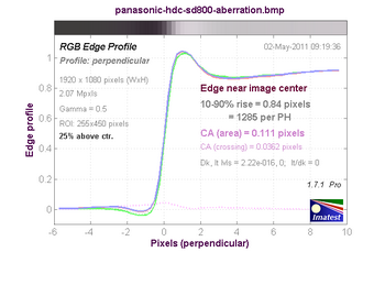 График хроматической аберрации (на самом деле, это тот же краевой профиль, только построенный по каждому цвету в отдельности). При значении параметра CA (area) равного 0—0,5 хроматическая аберрация незаметна.