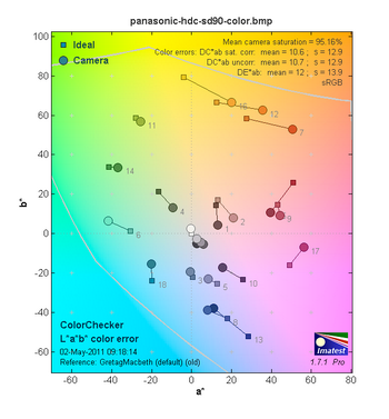 На следующей диаграмме в графической форме представлены отклонения зарегистрированных камерой цветов от идеала в цветовом пространстве CIE LAB. Данная диаграмма отклонения в Lab показывает, какую дает ошибку камера при передаче цвета.