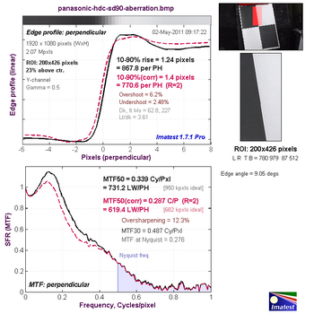 Верхний график представляет собой краевой профиль, для которого приведено значение 10—90% rise distance в пикселях, а нижний график — это MTF (Modular Transfer Function — функция передачи модуляции), для которой приведен параметр MTF50 в циклах на пиксель. Краевой профиль и MTF камеры показаны черной линией. Красной пунктирной линией обозначен краевой профиль и MTF, которые программа Imatest считает близкими к оптимальным. 10—90% rise distance и MTF50 также являются расчетными величинами Imatest.