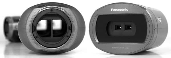 Одно из главных внешний отличий — появившиеся слева и справа от объектива два неглубоких паза. Размеры и глубина этих канавок различны, они предназначены для жёсткого и правильного фиксирования стереонасадки. Никаких «секретных» контактов в этих пазах не имеется — простые с виду углубления в прочном пластике.