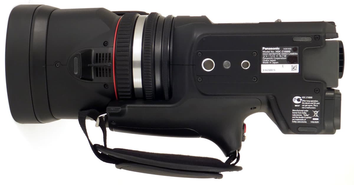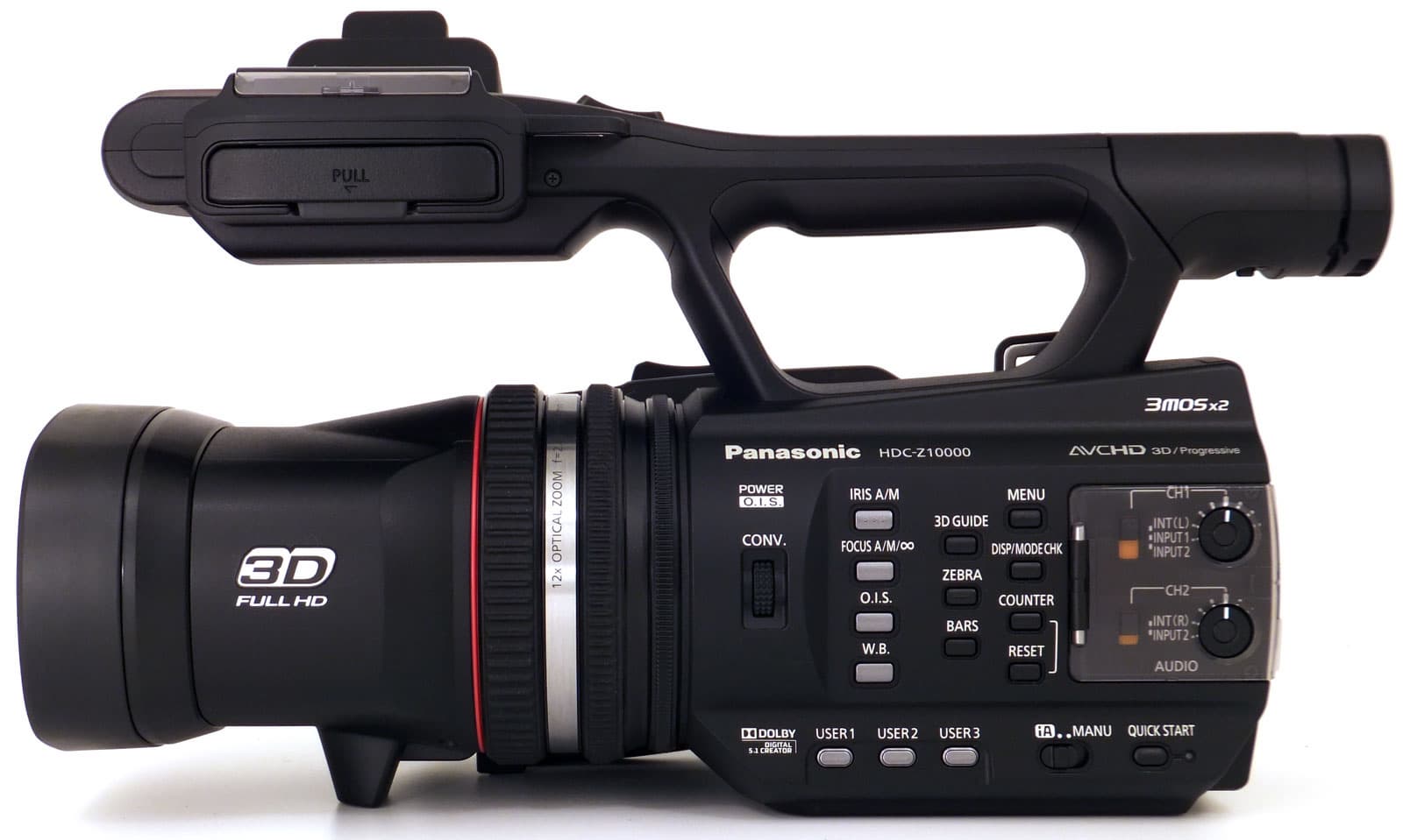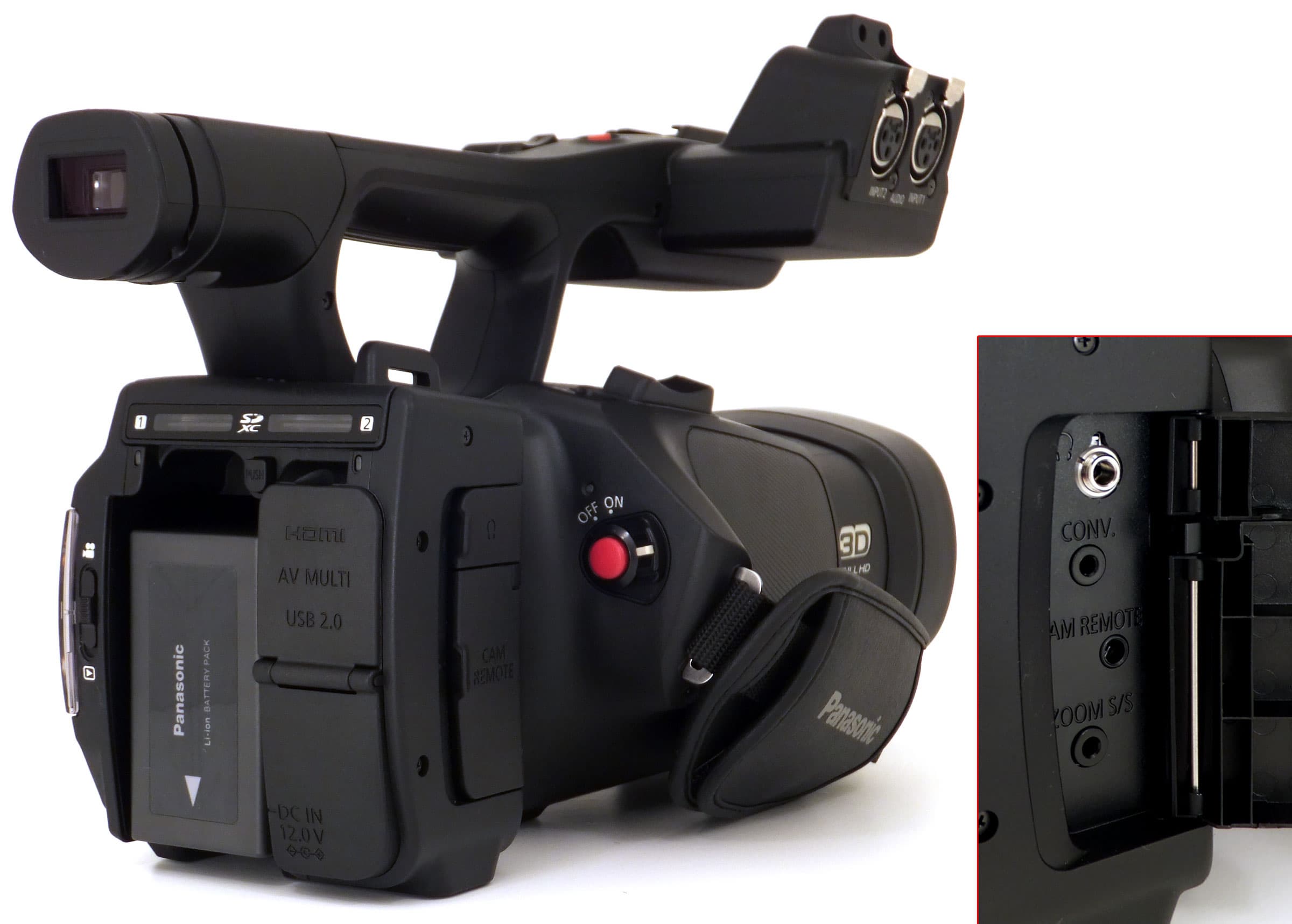 В углублении, находящемся сбоку корпуса, расположен поворотный переключатель, включающий камеру. В его центре — основная кнопка записи. Она также попадает под большой палец руки, если камера удерживается ладонью, просунутой под боковой ремешок. В свою очередь, вторая качалка зума, имеющаяся в верхней части корпуса камеры, попадает под указательный и средний пальцы. Рядом с качалкой имеется кнопка, нажатием на которую создаётся фотоснимок. Ближе к торцу аппарата видны две откидывающиеся дверцы. Верхняя скрывает под собой аудиовыход для подключения наушников, а нижняя дверца прячет ещё три коннектора, предназначенных для подключения средств дистанционной регулировки конвергенции (сведения осей), настройки фокуса или диафрагмы и, наконец, управления фокусным расстоянием (зумом).