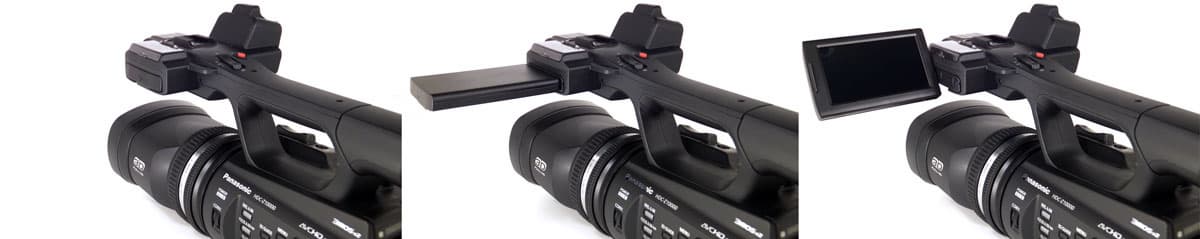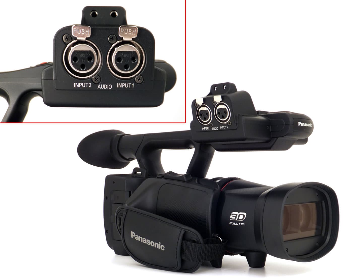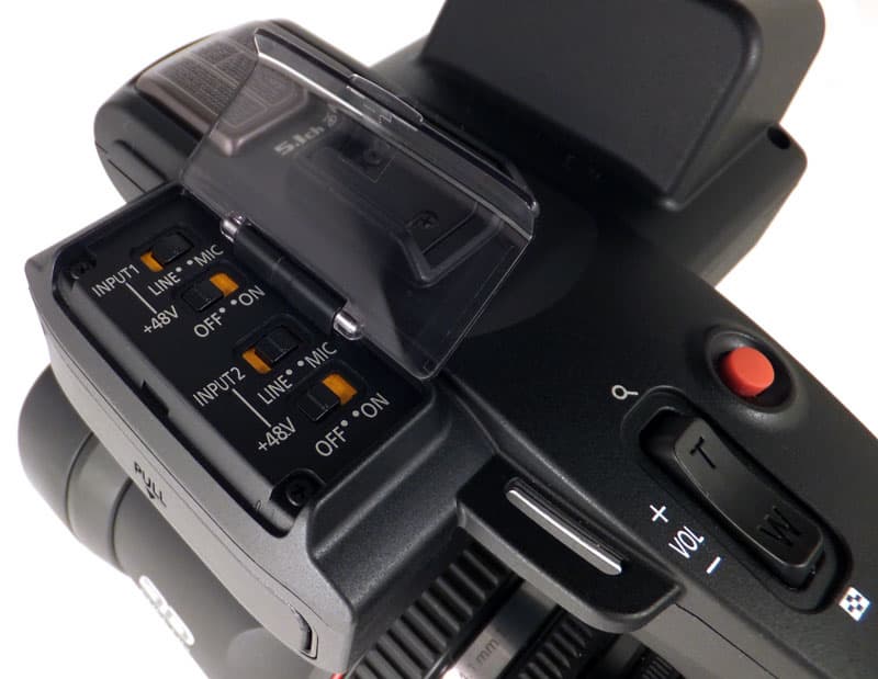 С другой стороны вынесенного вперёд от рукоятки блока имеется миниатюрный микшерный пульт с четырьмя двухпозиционными переключателями. Здесь имеется возможность включить/отключить соответствующий источник аудиосигнала, а также подать на него требуемое фантомное питание. Данный пульт накрыт прозрачной крышкой, что оберегает переключатели от случайного сдвига, но в то же время даёт возможность зрительно контролировать их положение. В самом центре верхней части блока имеется стандартная посадочная площадка-башмак для крепления аксессуаров (накамерного света). Наконец, впереди всего рассматриваемого блока расположены направленные вверх встроенные микрофоны, позволяющие видеокамере вести запись 5.1-канального звука. На рукоятке имеется ушко для ремешка, а рядом — качалка зума и дублирующая кнопка записи. Если видеокамеру удерживать за эту рукоятку, то кнопка и качалка ложатся точно под большой палец руки.