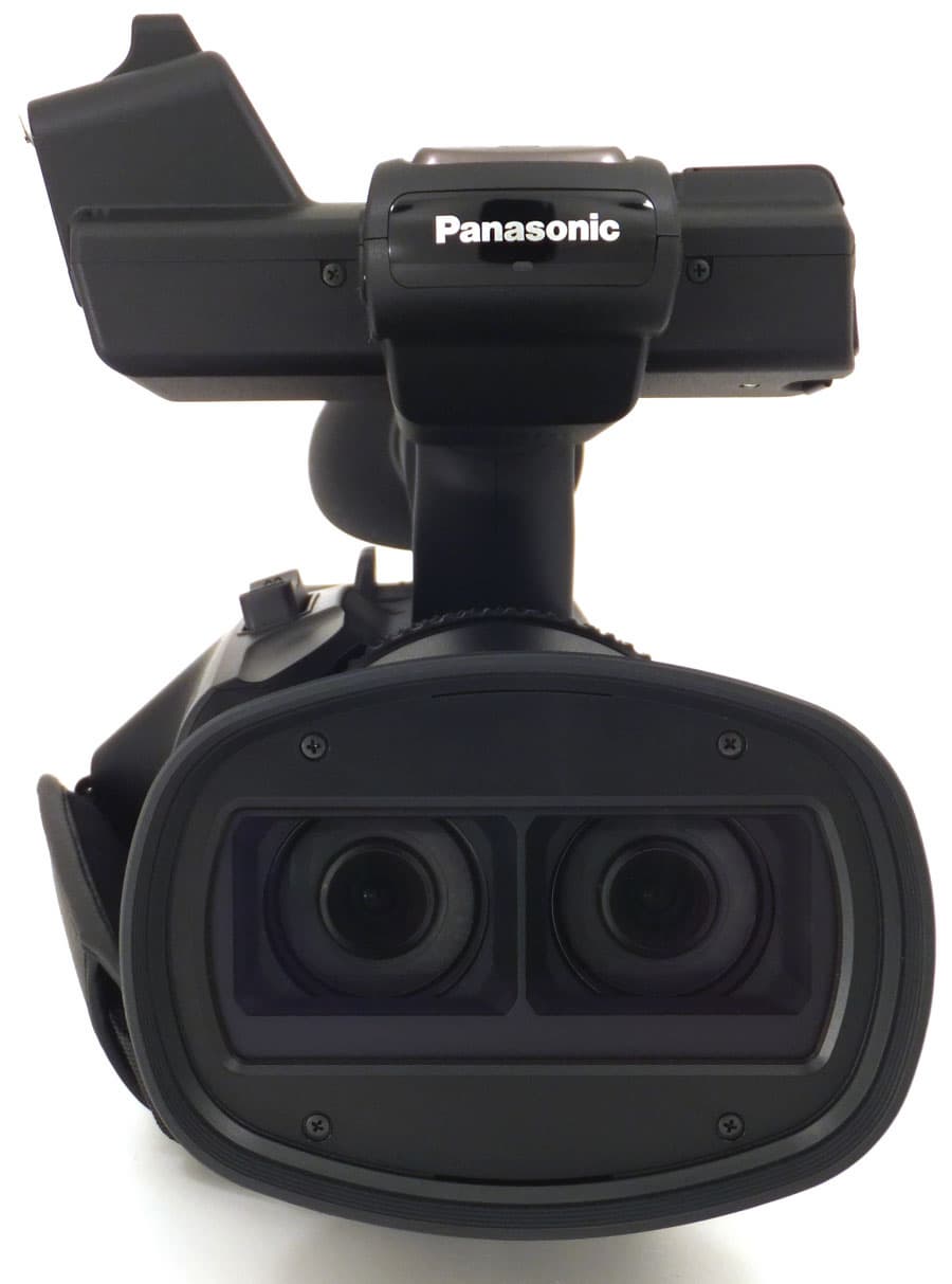 Анфас видеокамеры удивительно лаконичен. Никаких информационных надписей, кроме названия компании-разработчика (кстати, под этим чёрным стеклом с надписью Panasonic прячется датчик, принимающий сигналы с прилагаемого пульта ДУ). Объективы накрыты защитным стеклом — это новые объективы со светосилой F1,5 и специальным нанопокрытием поверхности.