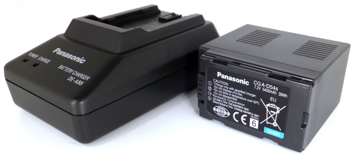 Прилагаемый аккумулятор подзаряжается только будучи вставленным в зарядное устройство. Батарея CG A-D54s ёмкостью 5400 мА·ч позволяет вести непрерывную запись до пяти часов в режиме 3D и до семи часов — в 2D-режиме. При тестировании камера записывала статичную картинку с выключенным ЖК-экраном (работал видоискатель) при комнатной температуре. Не следует забывать: в реальных условиях эксплуатации немалая часть энергии тратится на регулярное включение/выключение аппарата, задействование дополнительных механизмов, расходующих энергию (зум, стабилизатор), в режиме простоя или регулировки и т. д., что может сократить указанное время работы на треть. Нужно помнить и об окружающей температуре — при низких её значениях время работы аккумулятора также сокращается.