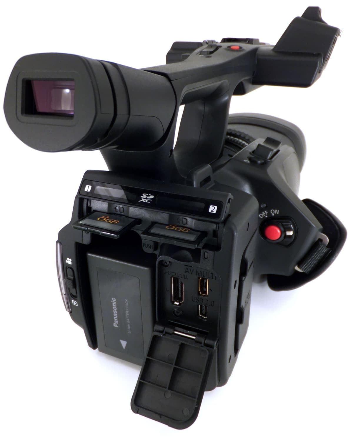 С торца аппарата также имеется откидная дверца, где находятся HDMI-выход (поддерживается вывод 3D-сигнала Full HD при наличии телевизора, соответствующего требованиям), комбинированный композитный и компонентный аудио/видеовыход (по компоненте также поддерживается вывод 3D-видео в формате горизонтальной стереопары) и порт USB. Верхняя часть торца представляет собой откидывающуюся дверцу-уголок, под которой находятся два слота под карты памяти. Две карты памяти нужны камере не только для расширения объёма. Гибкие настройки аппарата позволяют назначить каждой карте памяти свою роль. Например, видео можно записывать на первую карту памяти, а фото — только на вторую, или наоборот. Также можно настроить автоматический перескок на вторую карту памяти, если на первой карте закончилось свободное место. Но, пожалуй, наиболее оригинальным вариантом видится существующая возможность одновременной записи одного и того же материала сразу на обе карты памяти. Любой практик, сталкивавшийся с отказами капризных и нежных флэшек, наверняка оценит такую возможность дублирования.