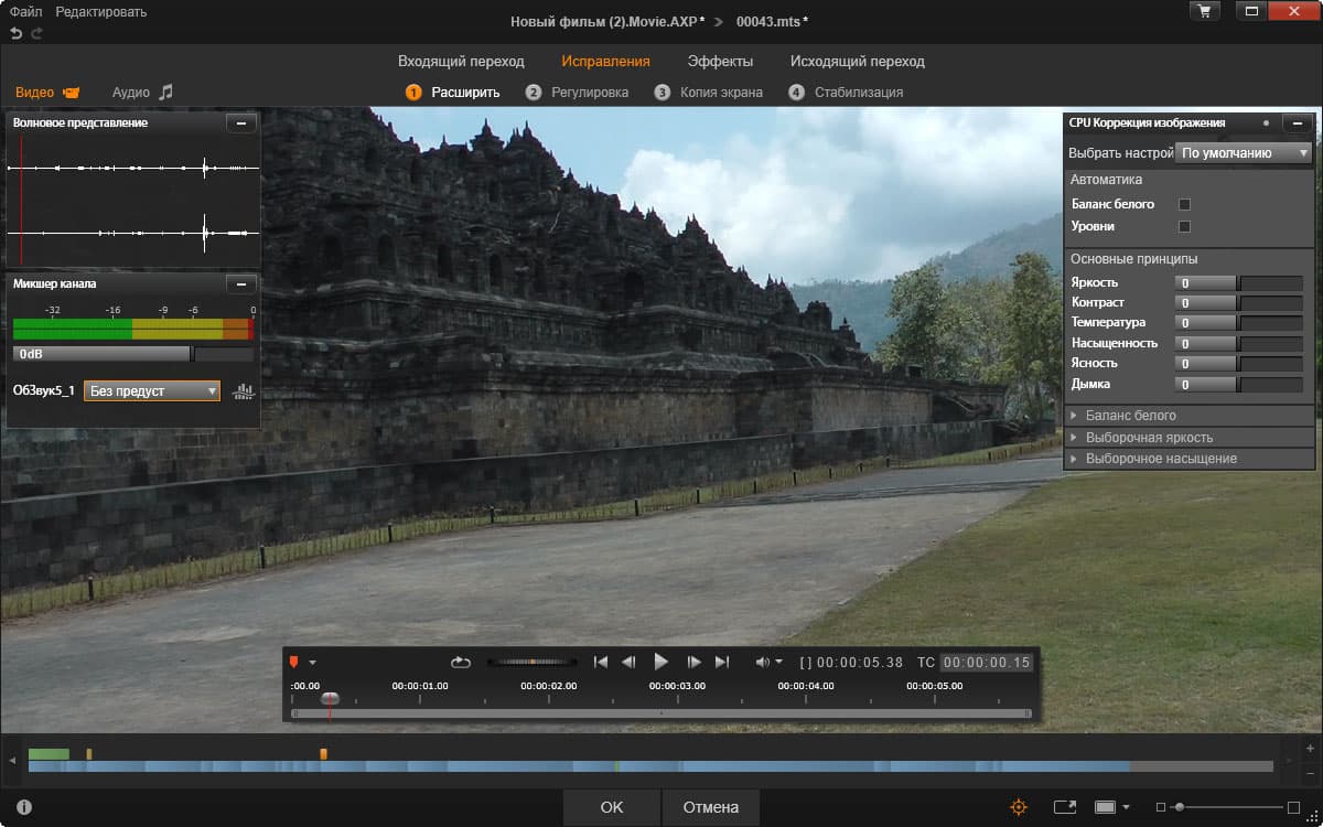 Структура работы с медиа на таймлинии построена на давнем известном принципе, когда каждый клип необходимо обрабатывать в отдельном окне — Редакторе эффектов. Допустим, что такой способ монтажа удобен домашнему пользователю, но большую серьезную работу таким путем вряд ли осилишь (впрочем, это уже говорят личные предпочтения автора, который с удовольствием выслушает иную точку зрения). Окно редактора эффектов богато настройками, здесь можно найти любой эффект, фильтр или переход. Действие выбранного фильтра тут же отображается в окне, тем или иным образом модифицируя картинку.