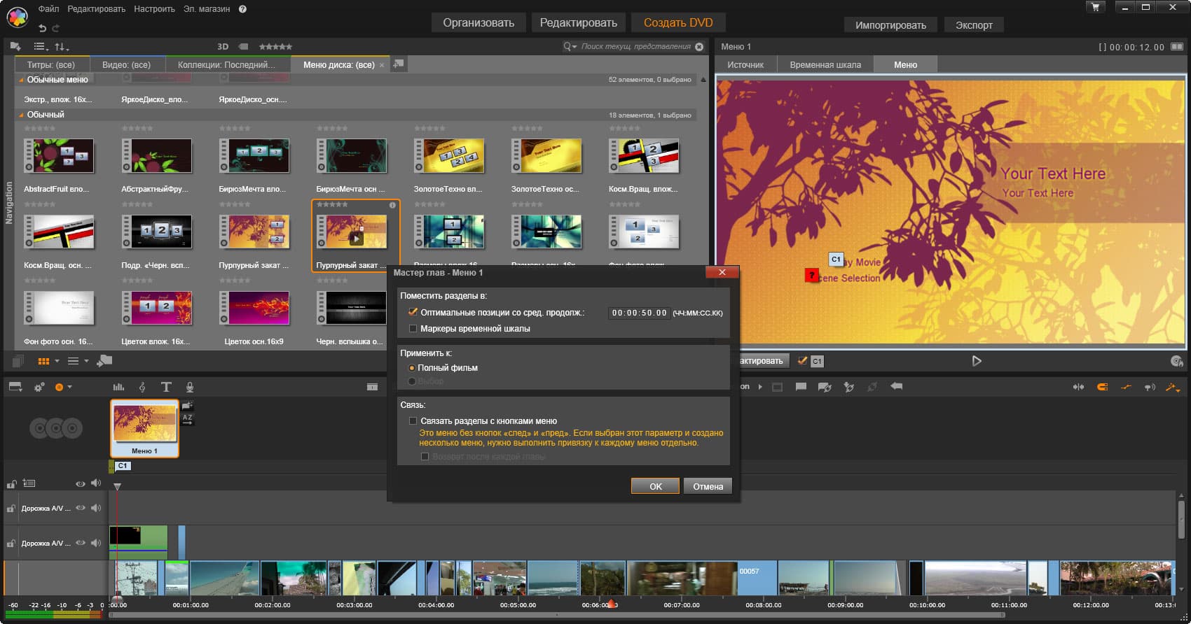 Вывод из программы смонтированного фильма возможен как обычным файлом, так и посредством авторинга диска. Данная операция производится во вкладке с названием DVD. Не пугайтесь, это название здесь только для краткости. Любая программа давно научилась создавать Blu-ray диски. Вот и мы попытаемся сотворить такой диск, добавив к фильму простенькое меню.
