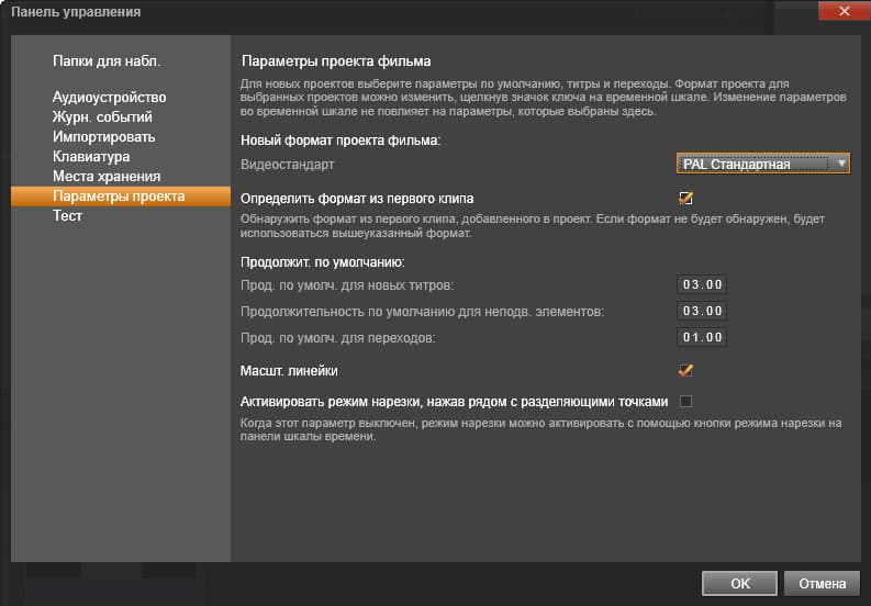 Следующий значимый раздел настроек — Параметры проекта. Здесь можно изменить разрешение и частоту кадров текущего проекта, а также ввести свои значения длительности титров, графики и переходов.
