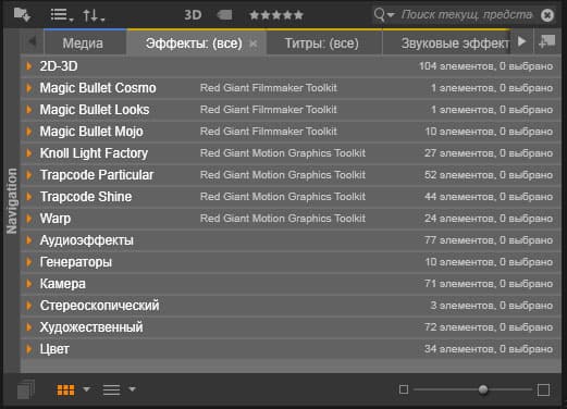 Список имеющихся в программе видеоэффектов, титров, аудиофильтров и прочего добра — просто огромен. Многие из визуальных эффектов имеют двухвариантное исполнение для использования в 2D- и 3D-проектах. Для того, чтобы применить выбранный фильтр или эффект к клипу, следует перетянуть его иконку на нужный клип — так делается в подавляющем большинстве программ.