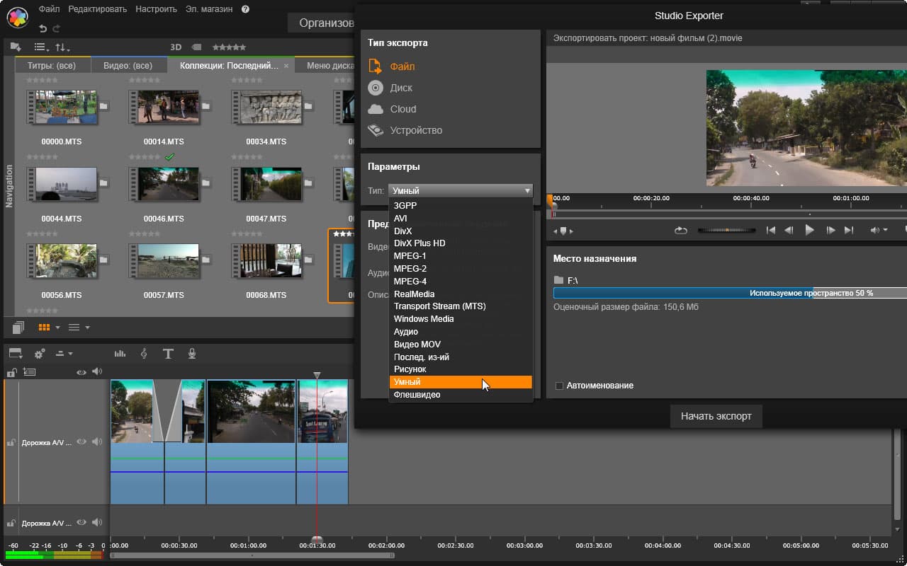 Внимательный зритель наверняка увидел эти отличия: в первом случае список типов файлов содержит пункт под названием «Умный», во втором случае данный список лишен этой умности. При этом в первом случае на таймлинии находится один-единственный видеофайл, тогда как во втором случае этих видеофайлов несколько. Каков вывод?