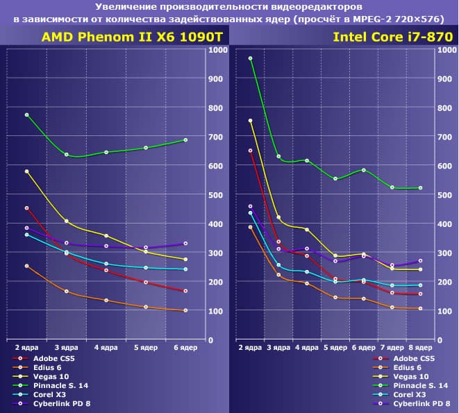 Трудно чем-то объяснить такую неторопливость, кроме как особенностью движка программы. Да и, если поднапрячь память, Pinnacle Studio и прежде не отличалась особой прыткостью. Стоит вспомнить, к примеру, такую диаграмму почти трехлетней давности: