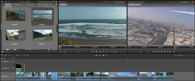 Окно предпросмотра имеет все необходимые инструменты для управления воспроизведением, включая колесо покадрово-челночного перемещения ползунка. Данное окно может быть разделено на два окна, в котором по отдельности отображается видео файла-источника, выбранного в библиотеке медиа, и видео с таймлинии.