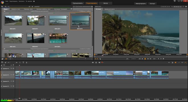 Интерфейс программы посуровел в сравнении с веселеньким интерфейсом прошлых версий. Стал более строгим, освободился от рюшечек, овальных элементиков и крупных нарядных кнопок, напоминающих елочные шары. Серьезной доработке подверглось окно, в котором отображается содержимое проекта и программы: изменяемые размеры миниатюр, возможность просмотреть каждый клип путем быстрой промотки с помощью всплывающего ползунка (killer-feature большинства серьезных монтажных программ), присвоение клипу или фотографии определенного количества звезд рейтинга, сортировка контента по различным признакам и т. д.