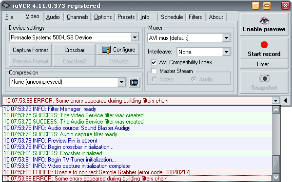 И здесь в списке доступных устройств фигурирует Pinnacle 500-USB, однако, при попытке выбрать это устройство в качестве источника, поведение iuVCR до боли напоминает действия Windows Moviemaker. Вердикт тот же.