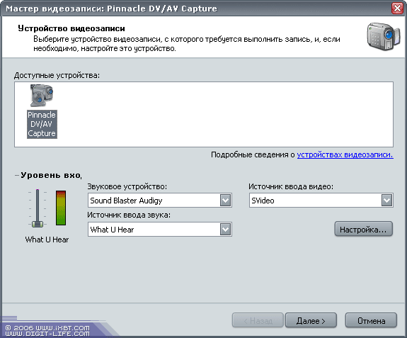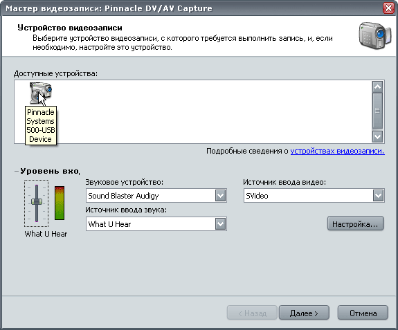 Интересно, а другие программы смогут работать с Pinnacle 500-USB? Давайте попробуем. Для начала запустим Windows Moviemaker. Да, список доступных устройств содержит нужный нам пункт. Кажется, можно радоваться?