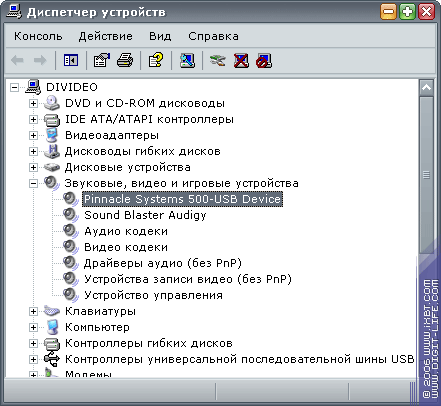 Драйверы, находящиеся на первом установочном диске, найдут свое место в системе буквально за минуту, после чего Диспетчер устройств пополнится новым пунктом Pinnacle Systems 500-USB Device.