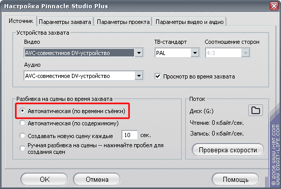 Так же, как и в случае с Pinnacle 500-USB, при захвате по IEEE 1394 в программе Studio Plus существует возможность автоматической разбивки на клипы по времени съемки.