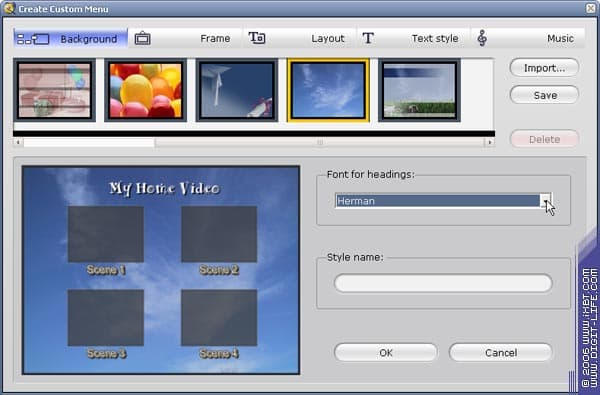Здесь можно выбрать фон меню (любые распространенные форматы изображений), форму и заливку рамок для будущих кнопок, способ расположения их в меню, стиль текста для заголовков. Заготовок в программе более чем достаточно. Можно подобрать и подходящее музыкальное сопровождение, которое будет проигрываться, пока активно меню. Изменить названия сцен не представляется возможным изменению поддается лишь заглавное название меню. После создания диска названия сцен будут представлять собой цифры, идущие по порядку. Кириллица поддерживается.