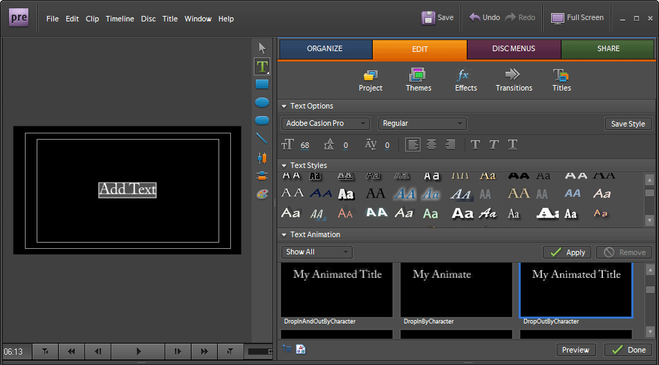 Редактор титров в программе выполнен в виде интегрированного модуля, то есть, при работе с титрами новых окон не появляется, все инструменты и основное окно заменяют собой отображавшиеся прежде элементы. Возможности редактора титров стандартны, здесь можно как вставить текст с нужным шрифтовым оформлением, так и добавить фоновые и иные рисунки или элементарные геометрические фигуры. Анимация титров производится с помощью заготовок анимации, коих насчитывается 38 штук.