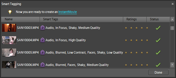 Создание фильма происходит быстро, буквально в считанные секунды, но при условии, что все участвующие в фильме клипы уже проанализированы с помощью модуля Smart Tagging. Если пользователь не позаботился об этом заранее, то перед созданием фильма программа все равно его произведет, не спрашивая разрешения.