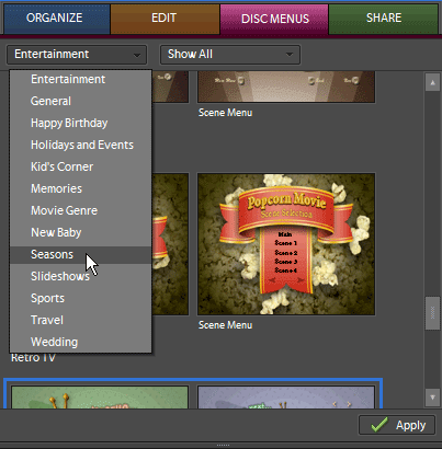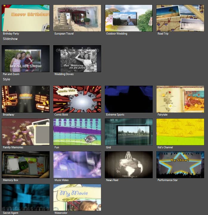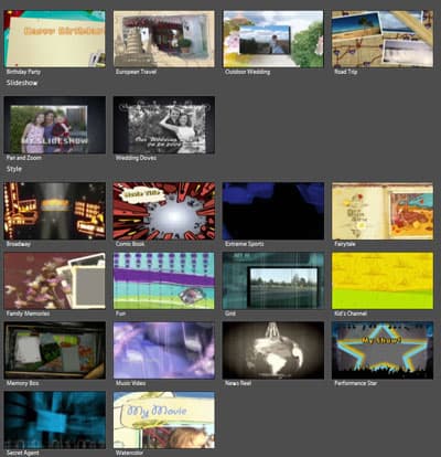 Программа предложит выбрать одну из тем оформления, всего их двадцать. Здесь и день рождения, и семейные, и детские стили. Есть и несколько свадебно-романтических шаблонов. Ярлыки шаблонов анимированы и представляют собой озвученный мини-фильм, просмотреть который можно, щелкнув по нему.