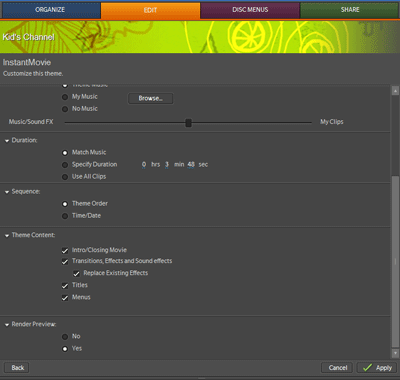 Настройки создания автофильма довольно богаты, здесь можно определить общую длительность, добавить свое музыкальное сопровождение, либо позволить программе озвучить фильм самостоятельно, взяв музыку из библиотеки шаблонов. Отношение громкости музыкального сопровождения к звуку клипов определяется специальным ползунком, здесь же флажками отмечается необходимость создания вступительного и заключительного титров (Intro/Closing Movie).