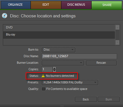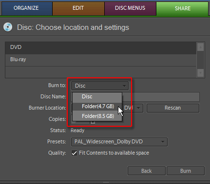 К сожалению, программа не умеет создавать Blu-ray видеодиски на стандартных DVD-носителях. Не может она сделать и образ или папку с файлами Blu-ray диска — ей непременно подавай соответствующий привод и носитель к нему, дабы немедленно прожечь фильм на "болванке":