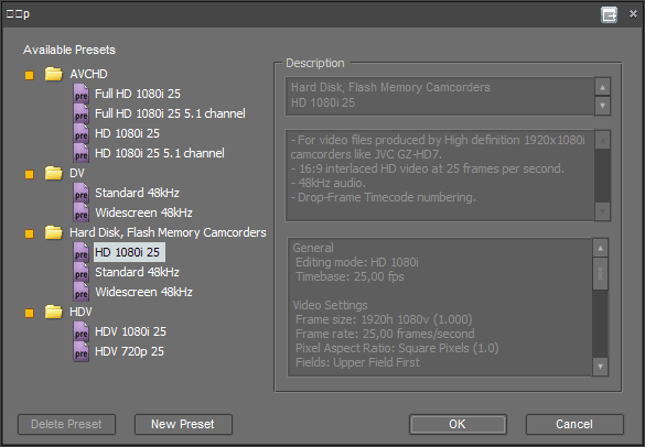 На рисунке представлен список доступных в программе шаблонов проектов, где присутствуют практически все распространенные сегодня форматы, включая AVCHD и HDV. Практически, но не все. Снова несправедливость... Почему изученные нами за последнее время любительские программы совершенно игнорируют существование еще одного, не менее распространенного формата - AVCHD 720p? Файлы с такими характеристиками выдают многие любительские видеокамеры, например, Sanyo Xacti VPC-HD700.