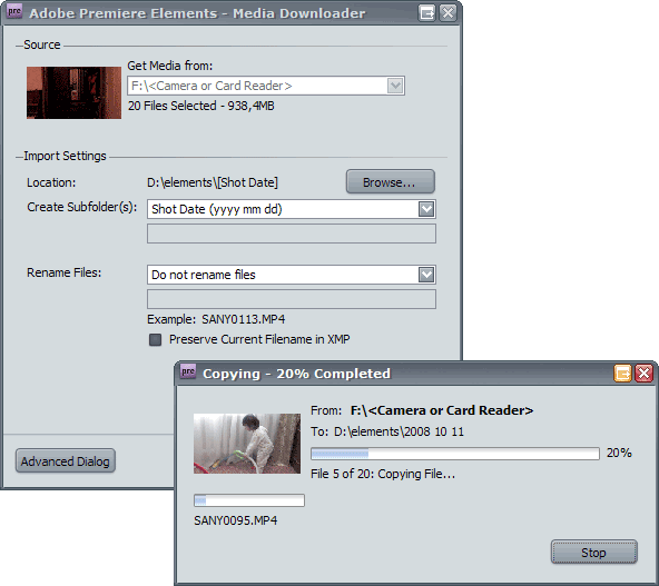 Вместо того чтобы просто открыть файлы, находящиеся, например, на карте памяти, Premiere Elements требует, чтобы вы запустили специальный модуль — Media Downloader. Да, здесь операция импорта материала достаточно наглядна, но так ли велика необходимость в отдельном инструменте, только и умеющем, что копировать да переименовывать файлы?