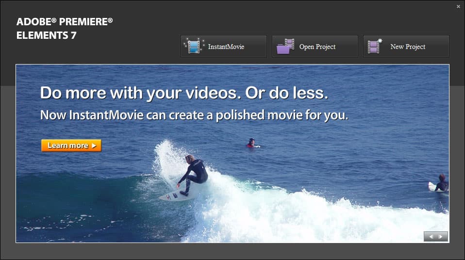 Обновленная программа встречает пользователя заставкой, демонстрирующей возможности пакета. Здесь предлагается быстро создать фильм (модуль InstantMovie, автоматически генерирующий видеоролики на заданную тематику, будет рассмотрен далее), открыть существующий проект, либо начать новый.