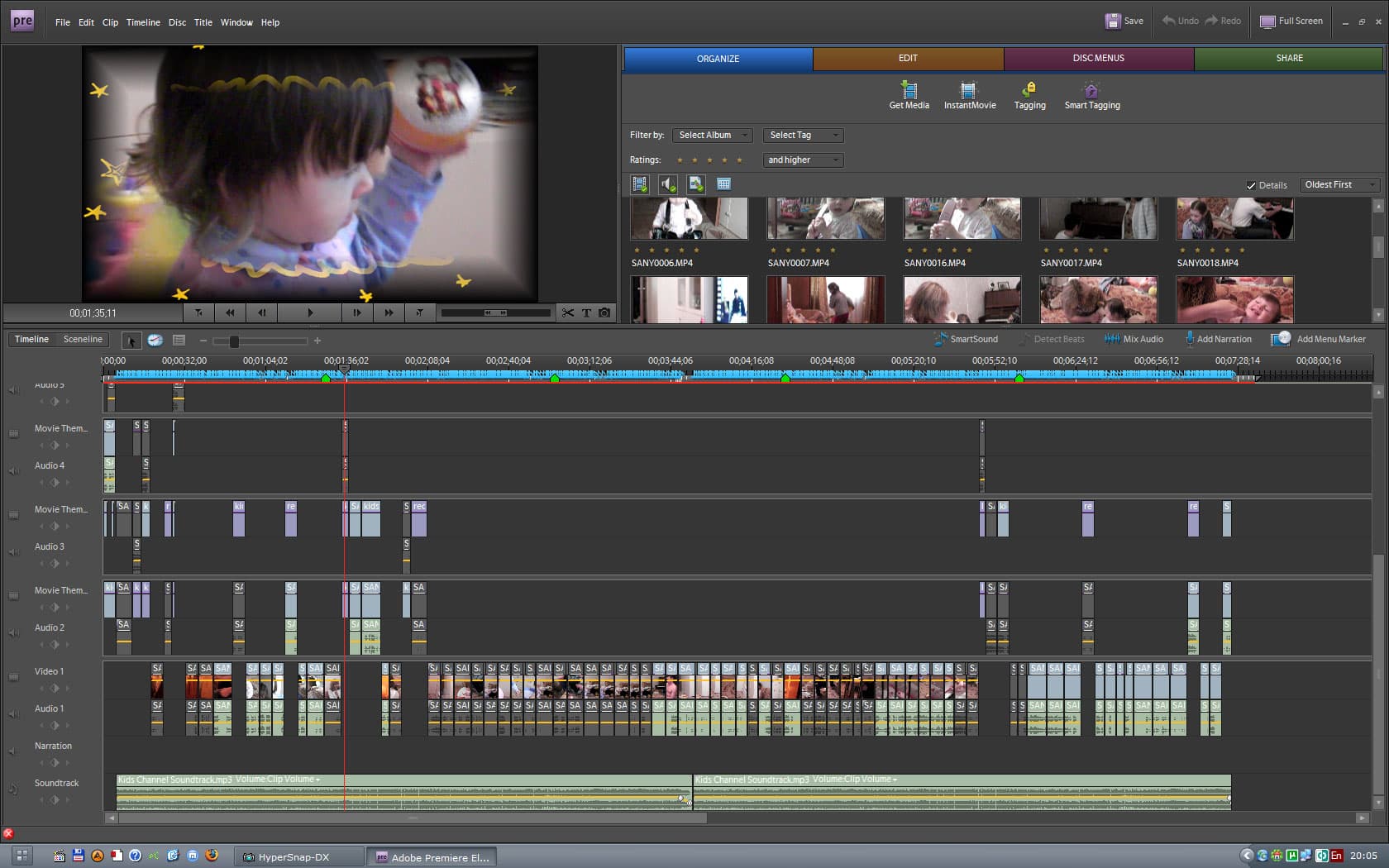 В отличие от множества любительских программ Premiere Elements предусматривает работу с любым количеством дорожек на таймлинии (до ста штук), что позволяет создавать многослойное видео, в котором могут участвовать как титры, так и разного рода футажи и эффекты.