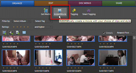 Вначале необходимо выделить те клипы, которые должны войти в фильм, и нажать кнопку InstantMovie.