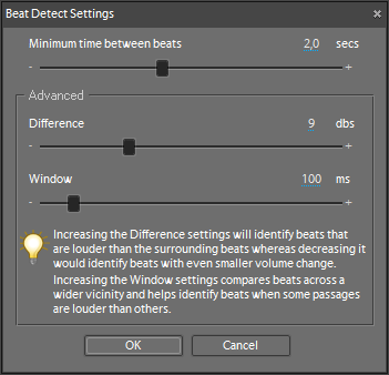 Этот инструмент имеет настройки, определяющие минимальное время между проставляемыми на таймлинии пиками, здесь же задается чувствительность детектора.