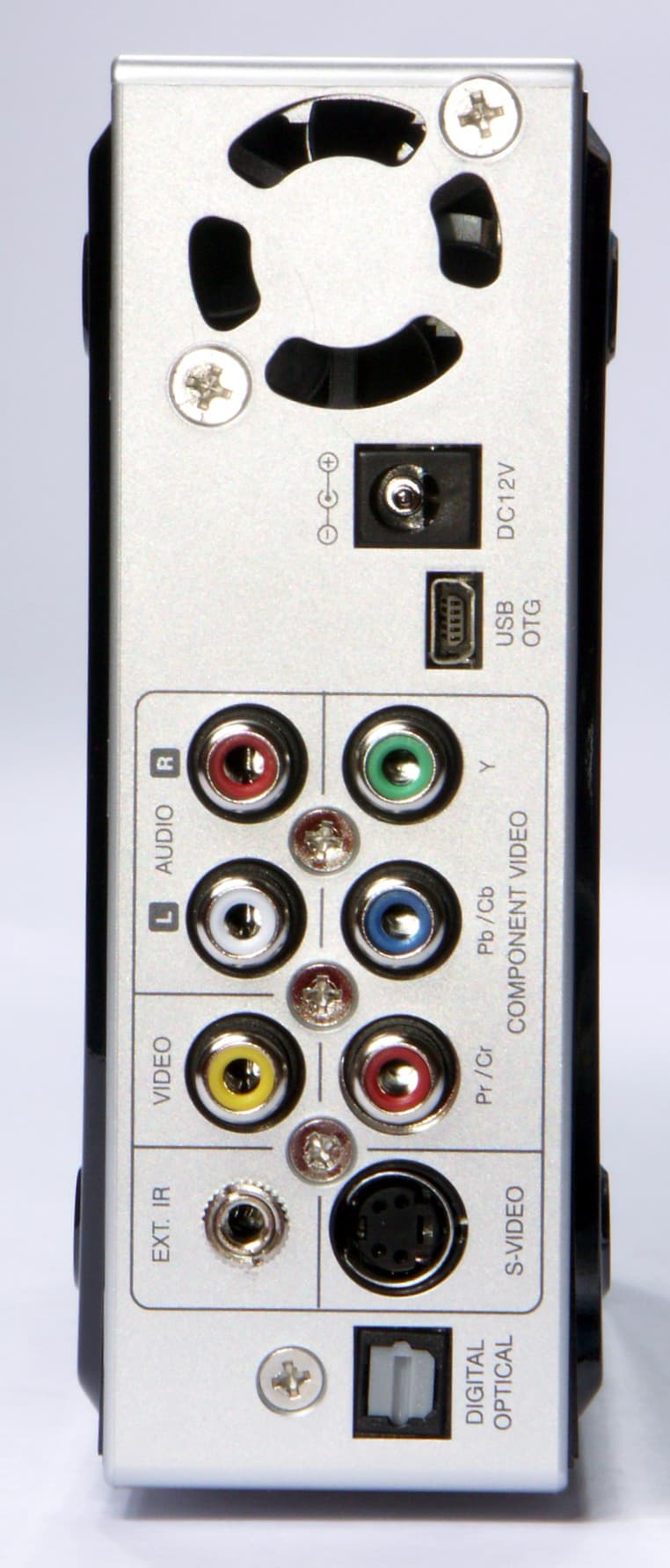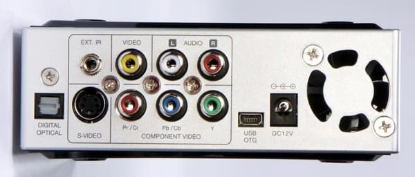Ниже вентилятора (который грамотно размещен и работает на выдувание) сгруппированы все разъемы. Это вход питания, интерфейсный Mini-USB, три «тюльпана» компонентного видеовыхода и еще 3 RCA-разъема для аналогового стереозвука и композитного видео. Далее разъем для внешнего ИК-датчика, выход S-Video и оптический аудиовыход. Стандартный джентльменский набор, которым должно обладать современное устройство такого типа.