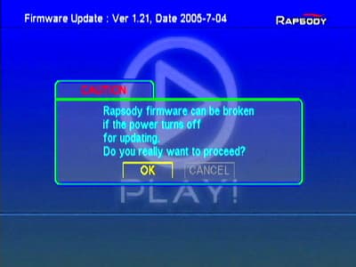 после утвердительного ответа Rapsody стирает старую прошивку, записывает новую, и перезагружается уже с новой версией.