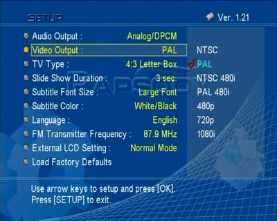 Можно выбрать тип аудио на выходе, стандарт видео (PAL/NTSC), разрешение на выходе скейлера, соотношение сторон экрана, время задержки слайдшоу, размер и цвет шрифта субтитров, частоту FM-передатчика (если таковой имеется).