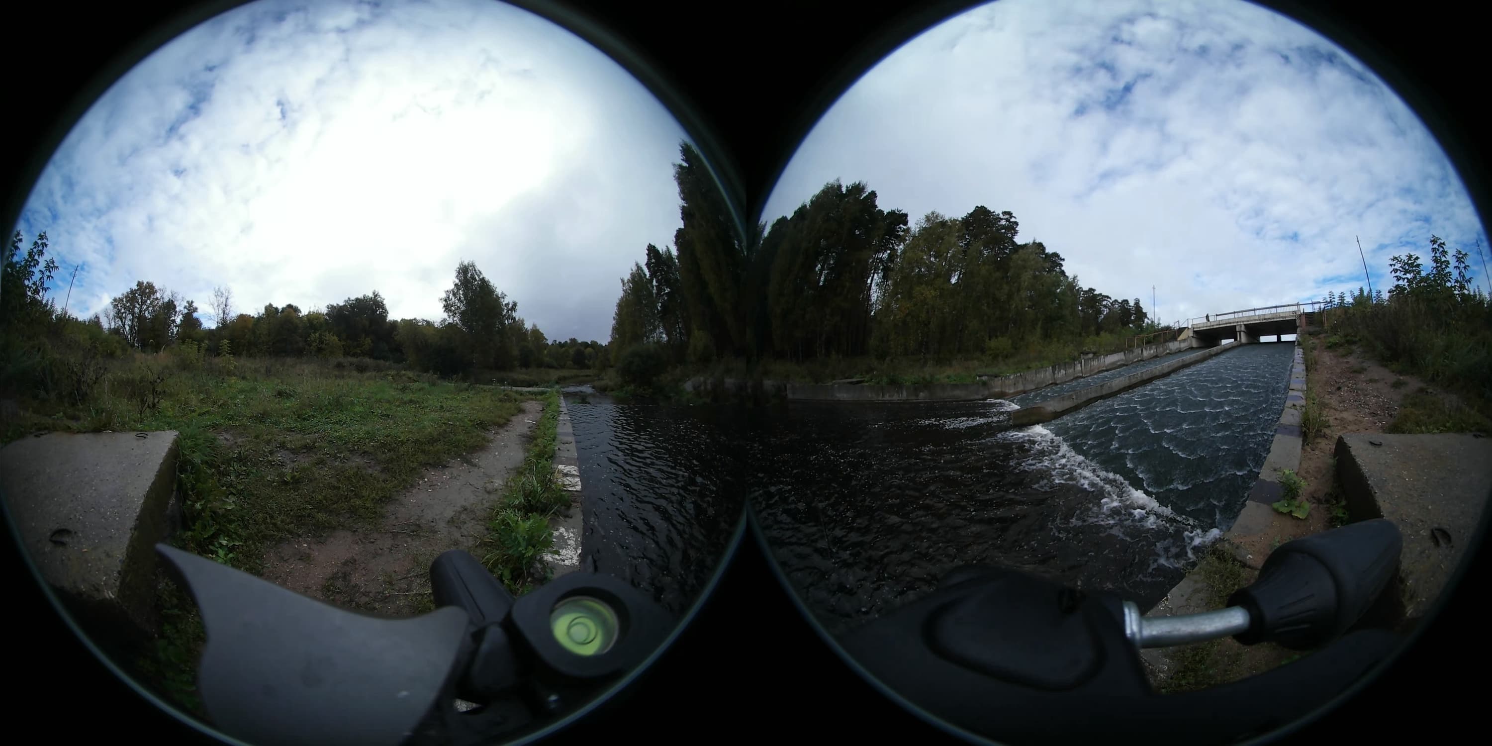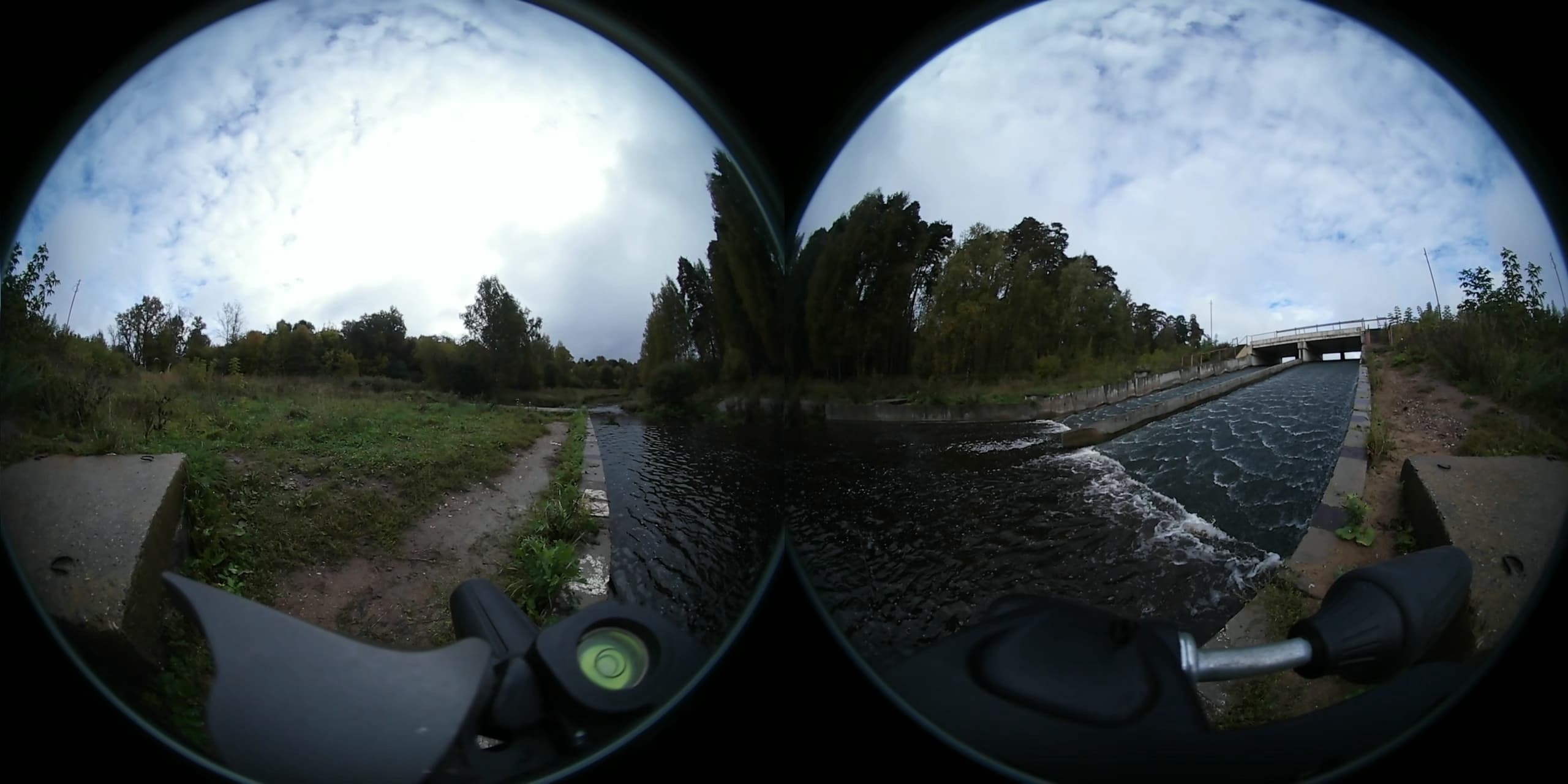 Изучать качество сжатия рассматриваемой камерой можно было бы всерьез, если бы не один фактор, а именно — геометрические искажения. Которые скрадывают не только недостатки, но и, к сожалению, большую часть достоинств. Две полусферы на черном фоне — не так уж и много битрейта требуется, чтобы закодировать такую картинку с достаточно высоким качеством. Тем более, используя для этого новый высокоэффективный кодек HEVC, он же H.265. Ниже приведены участки стоп-кадров, взятых из видеозаписей бегущей воды: явных огрехов кодировщика не имеется, выраженной пикселизации не наблюдается. Впрочем, это и немудрено в силу все той же сверхширокоугольности объективов: широкая полоса воды занимает лишь малую часть кадра, а вся остальная площадь — статика, не требующая серьезного битрейта.