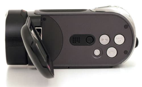 Объектив защищён шторками, автоматически раскрывающимися при включении аппарата. Небольшое углубление в верхней части корпуса, выстеленное шероховатым пластиком, предназначено для более удобного захвата видеокамеры.